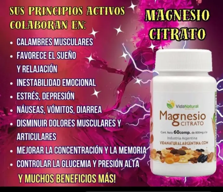 El citrato de magnesio es una sal de magnesio y ácido cítrico, usada principalmente como laxante salino para el estreñimiento ocasional, ya que atrae agua al intestino para ablandar las heces y estimular la evacuación. También funciona como suplemento dietético para compensar la falta de magnesio, ayudando en la función muscular y nerviosa, reduciendo calambres, fatiga, estrés y apoyando la salud ósea, pero en exceso puede causar diarrea y deshidratación. Beneficios para la salud cardíaca.